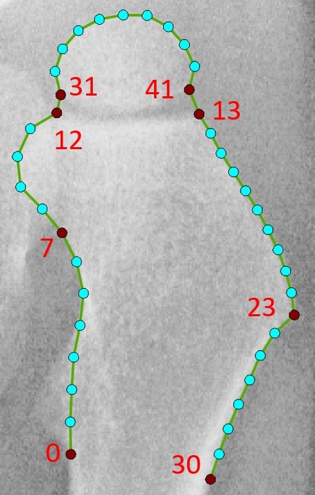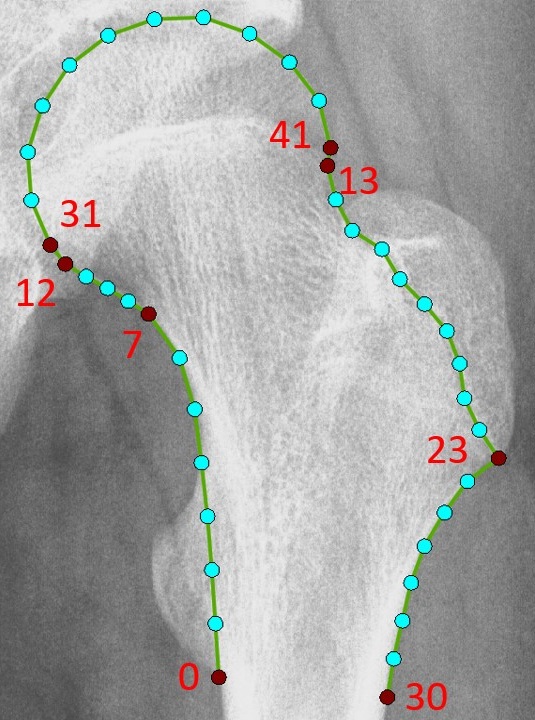 Segmentation example showing the outline of a children's proximal femur. Our BoneFinder® module achieved a point-to-curve-error of less than 4% of the femoral shaft width for 95% of all 1179 images.