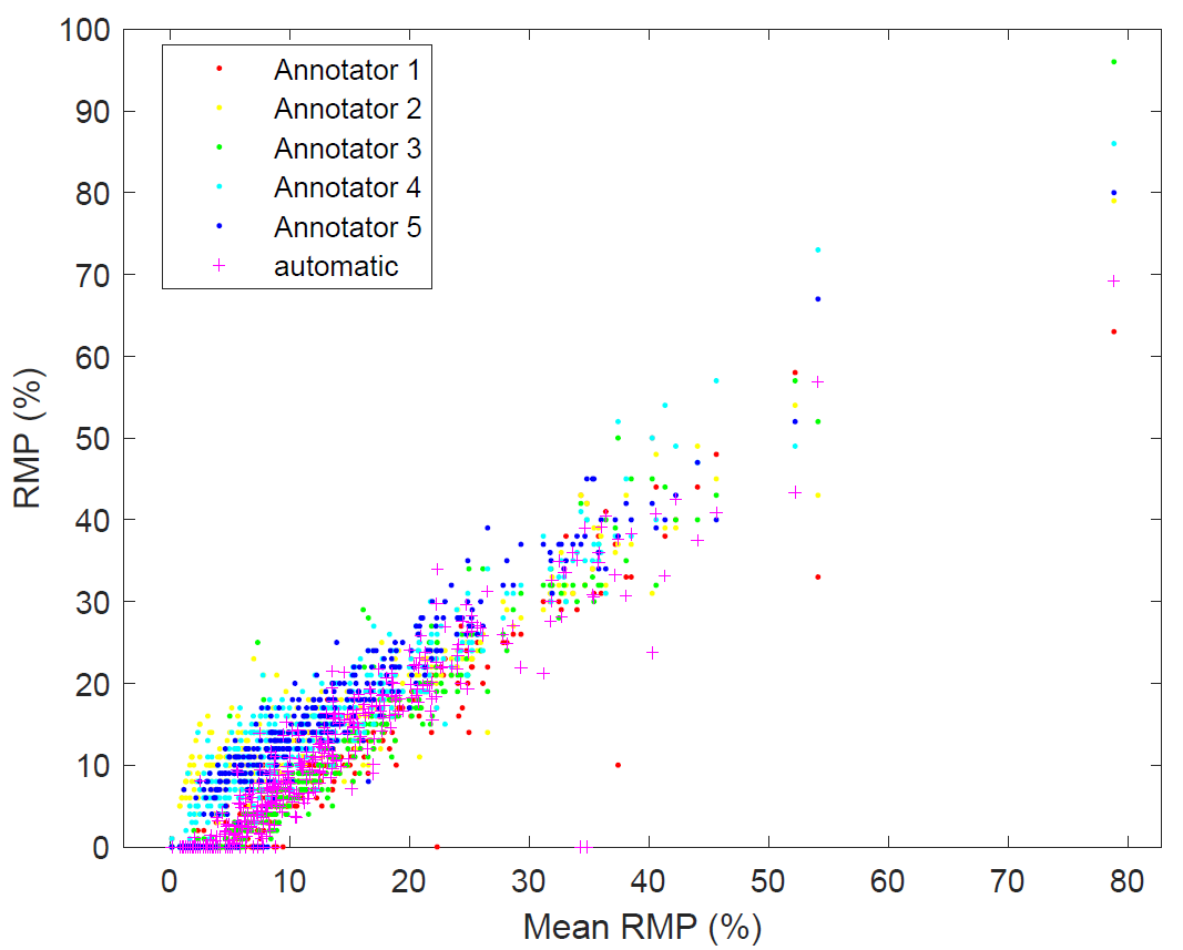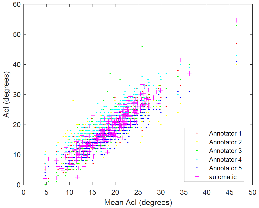 The performance of the automatic system showed good agreement with the average manual measurements with inter-correlation coefficients (ICCs) between 0.78 and 0.92. Our results show that the fully automatically obtained AcI and RMP measurements are in agreement with manual measurements obtained by clinical experts.